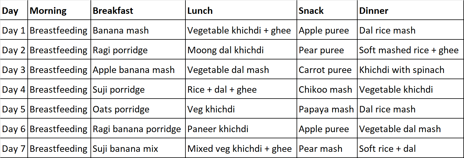 The above meal plan is provided for general informational purposes only and may not be suitable for every baby, as each infant’s nutritional needs, growth patterns, and health conditions are unique. What works for one child may not be appropriate for another. Therefore, it is always recommended to consult a qualified dietician or nutritionist to create a customized and personalized meal plan that best supports your baby’s individual growth and development needs.